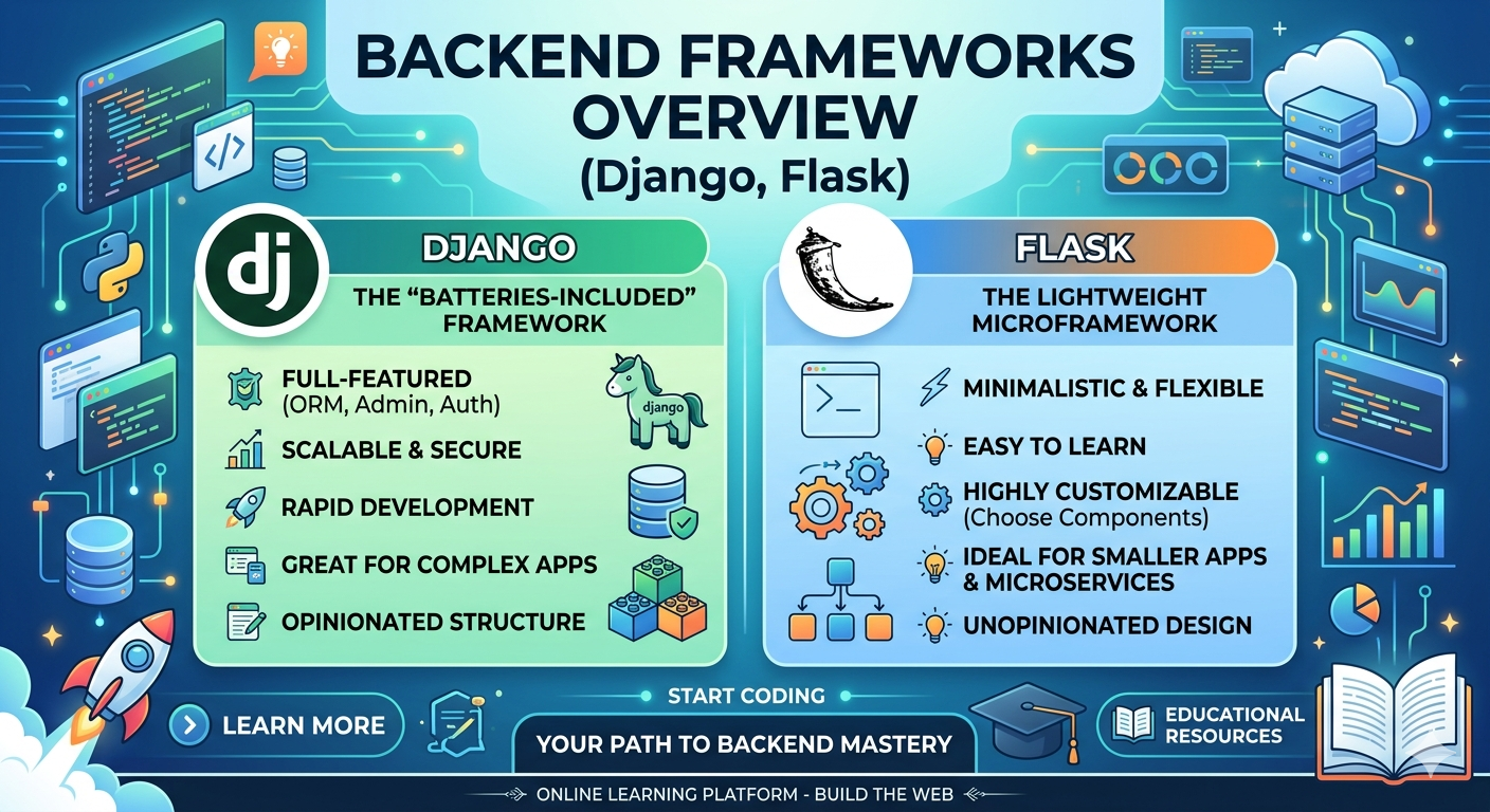 Backend frameworks like Django and Flask simplify server-side development by providing structured tools, libraries, and conventions. This course introduces learners to these two popular Python frameworks, highlighting their differences, strengths, and practical applications in building web applications.