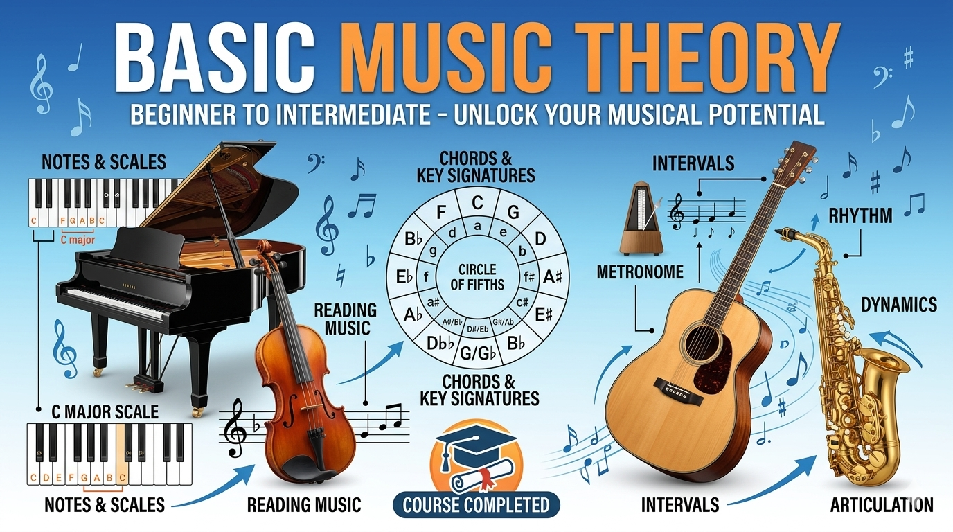 This course introduces the fundamental concepts of music, designed for beginners who want to understand how music works. Students will learn about musical notes, scales, rhythm, melody, and harmony in a simple and practical way.